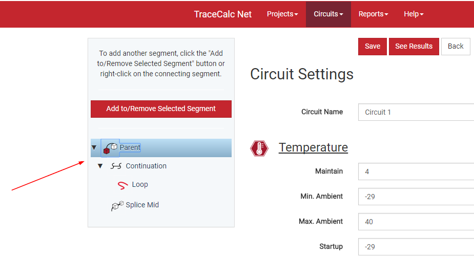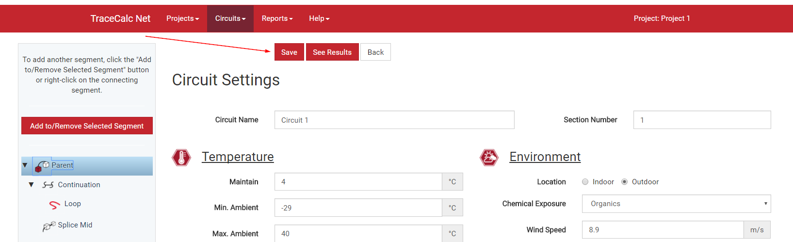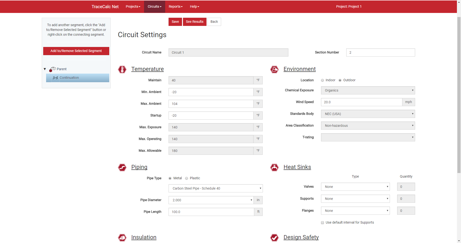 Once you have completed the circuit settings for all necessary segments, click “See Results” to view design results. If your circuit has multiple segments, click on the different segments in the segment tree to view design results for each one.