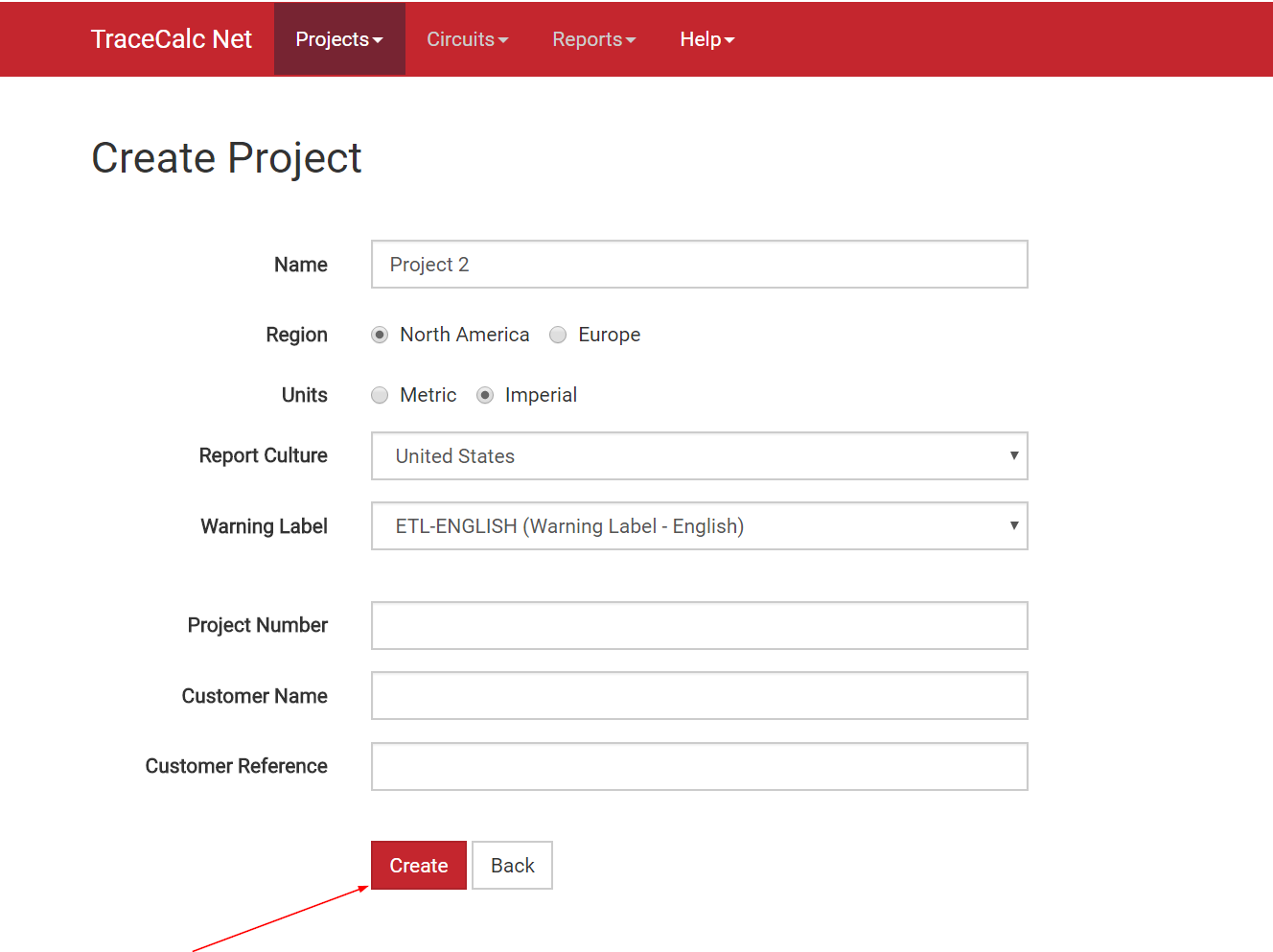 Once logged into the TraceCalc Net web application, click “Create Project”. This will take you to the Create Project form.