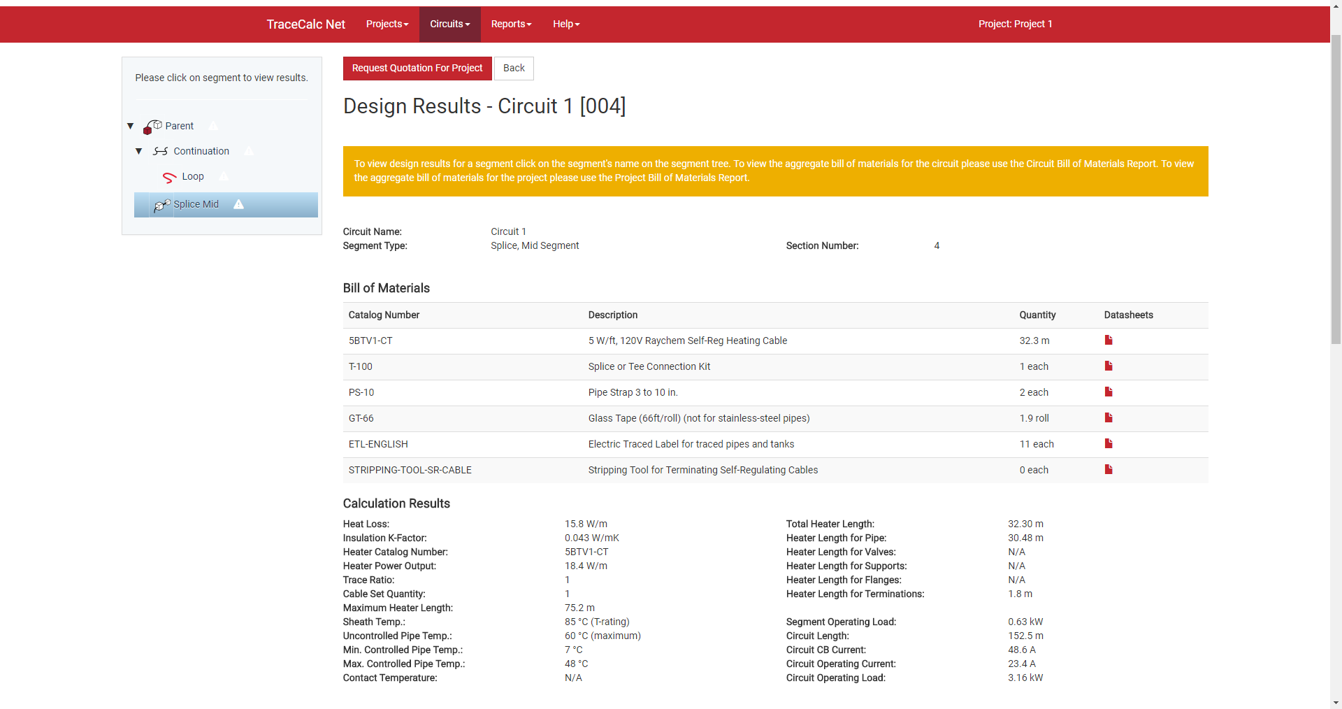 After reviewing these results, you may either click “Back” to return to the Circuit Settings form, or you may click “Request Quotation for this Project” to open the Quotation Request form.
