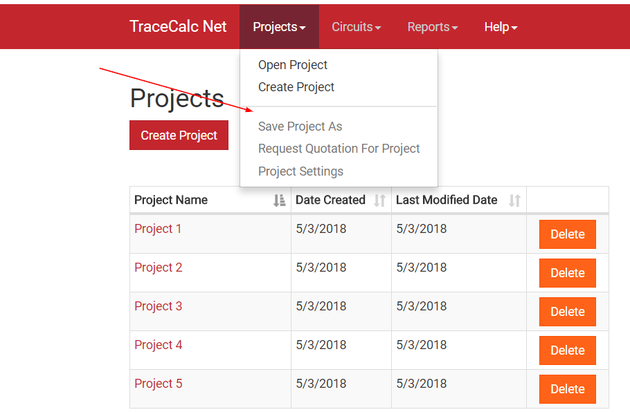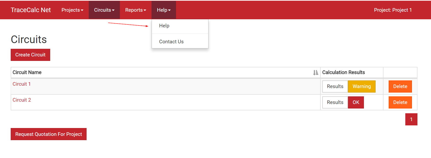 Once logged into TraceCalc Net, you will notice 4 menu options at the top of your screen. Please note that while you are on the Projects page, the only menus available to you will be “Projects” and “Help”. To enable to other menu selections you will have to open up a circuit list or specific circuit.