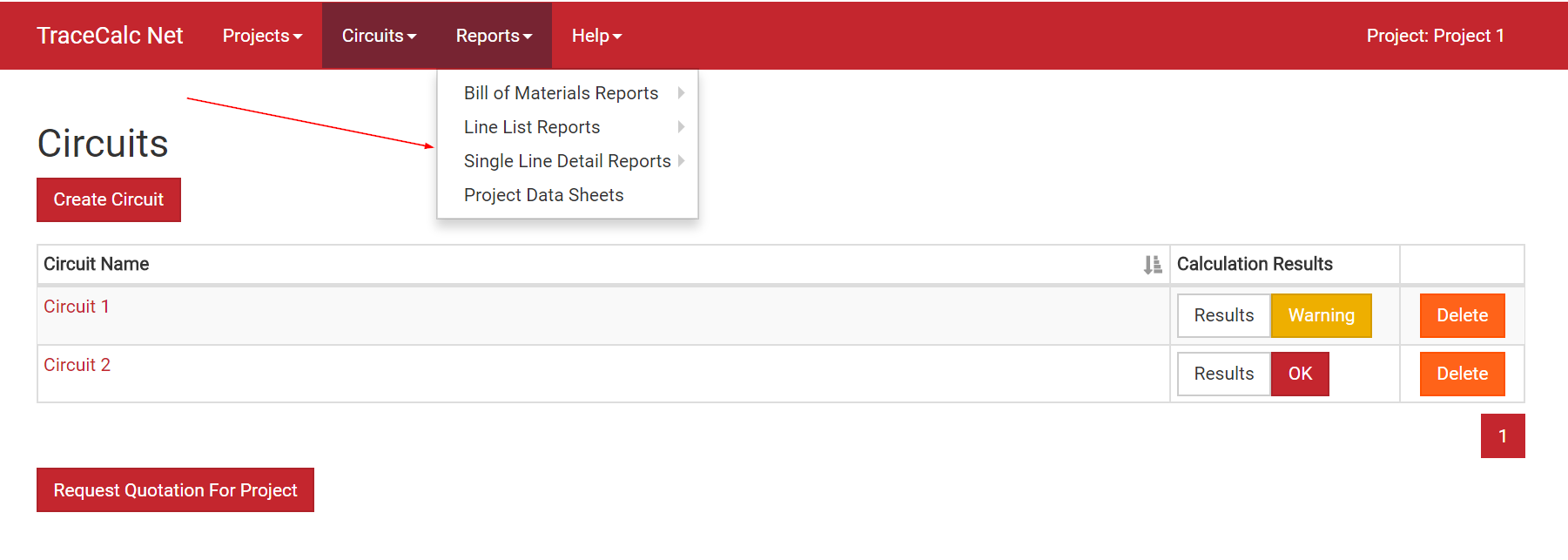 Circuit Single Line Detail Report: You must select a circuit to run this report. It will collect the calculation results, bill of materials, and input parameters for a single circuit in your project.